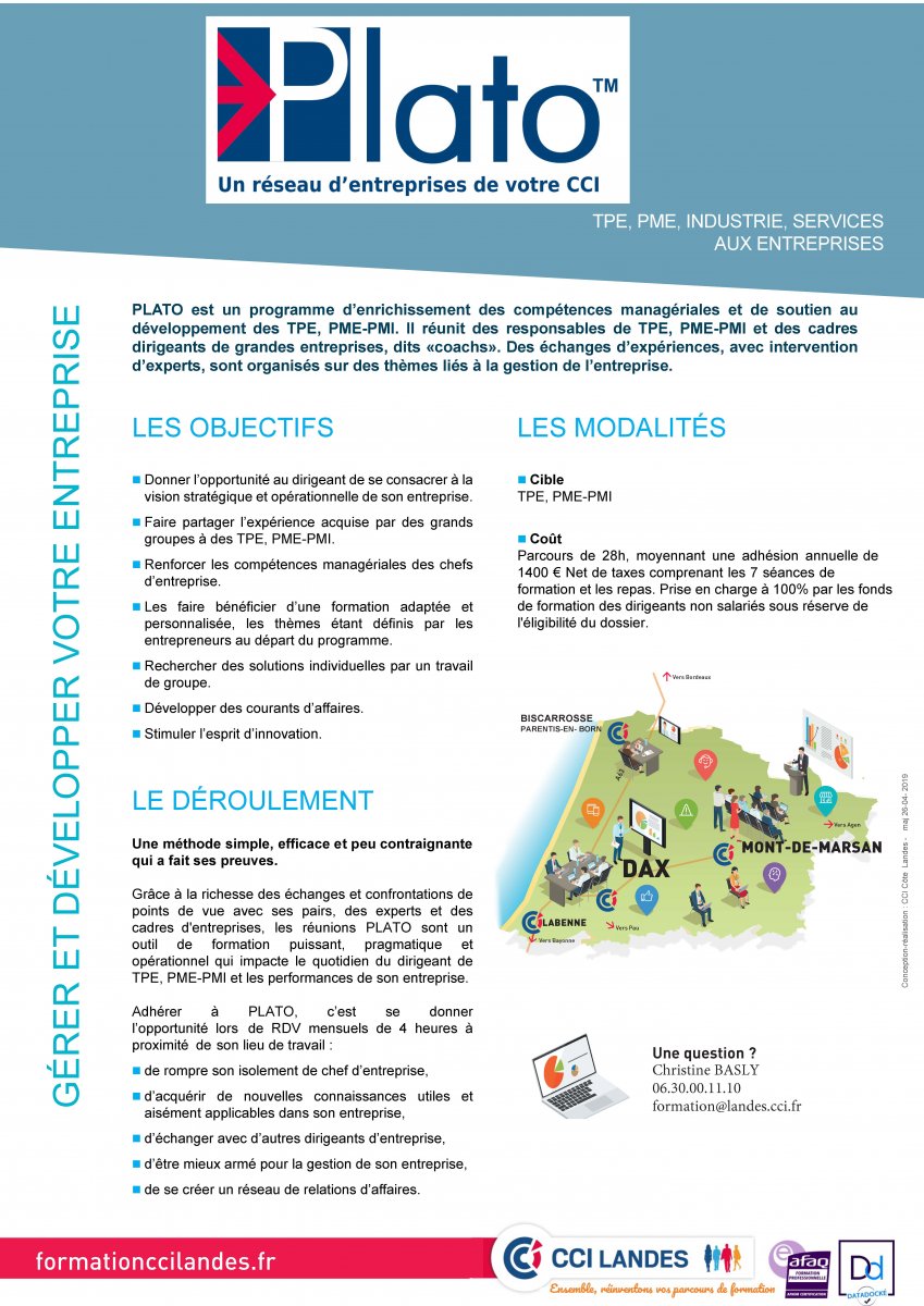 PLATO™ est un programme d’enrichissement des compétences managériales et de soutien au développement des TPE, PME-PMI. Il réunit des responsables de TPE, PME-PMI et des cadres dirigeants de grandes entreprises, dits «coachs». Des échanges d’expériences, avec intervention d’experts, sont organisés sur des thèmes liés à la gestion de l’entreprise.